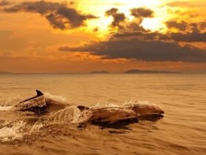 Hvis I er heldige, så ser I op til 5 forskellige delfine-arter, som springer op ad vandet imod den fantastiske orangerøde solopgang i baggrunden.
